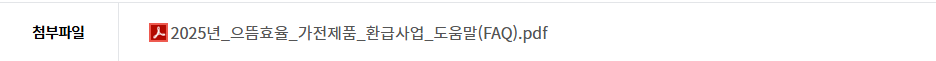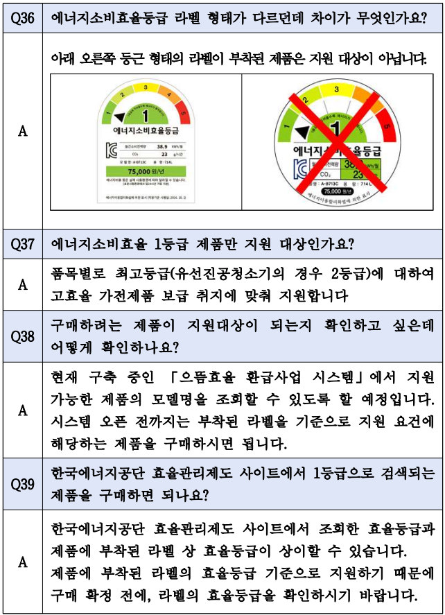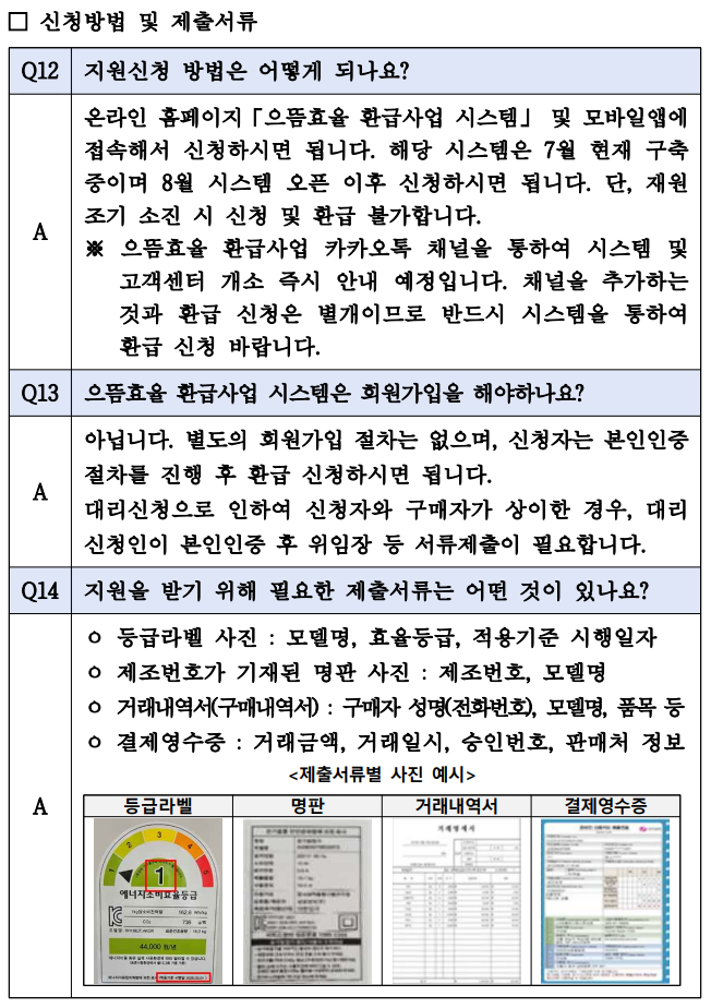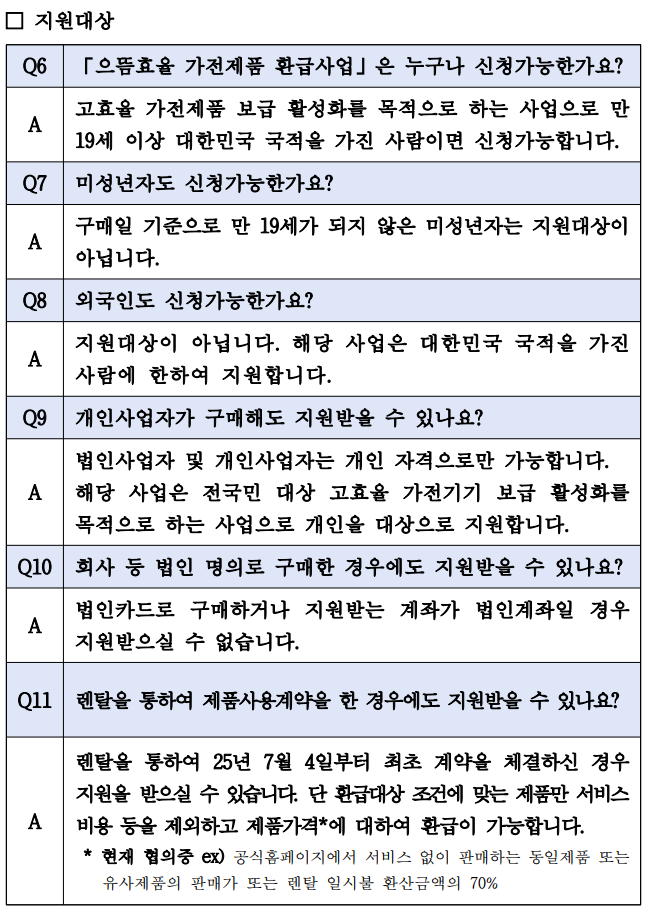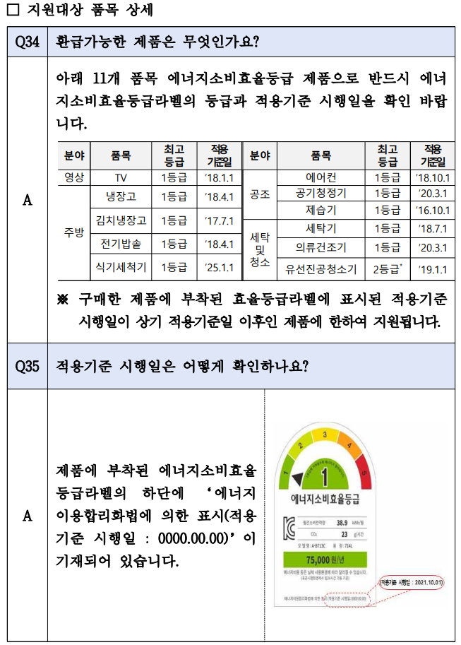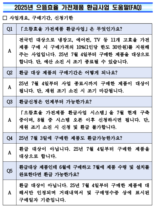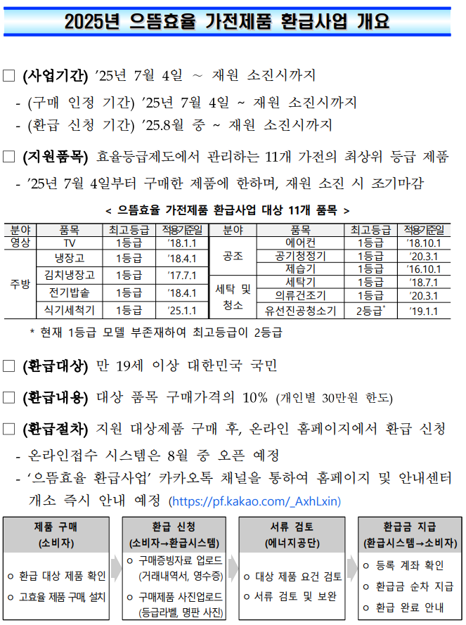 □ 한국에너지공단은 지난 7월 정부가 발표한 내수진작과 고효율 가전제품 보급 확대를 위한 “으뜸효율 가전제품 환급사업”을 2025.7.4일부터 시행합니다. 관련하여 세부사항을 아래와